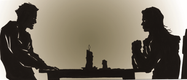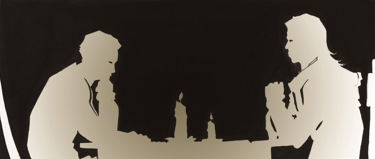 So what do we see? We see that Edgar made a choice to not allow for any other colors within these two panels, but instead presented them as a pair of black and white moments. Two men, representing opposite beliefs about their world, are separated by the small table.