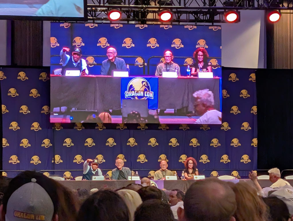 After years of opting not to sit in a line for an hour or two before a panel, Courtney and I opted to “snipe” the panel after the people waiting in line were let into the room. With this one there were about 10 or so rows left at the back, so we slid in about 10 minutes into the panel.